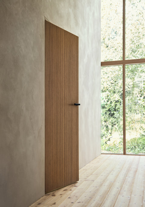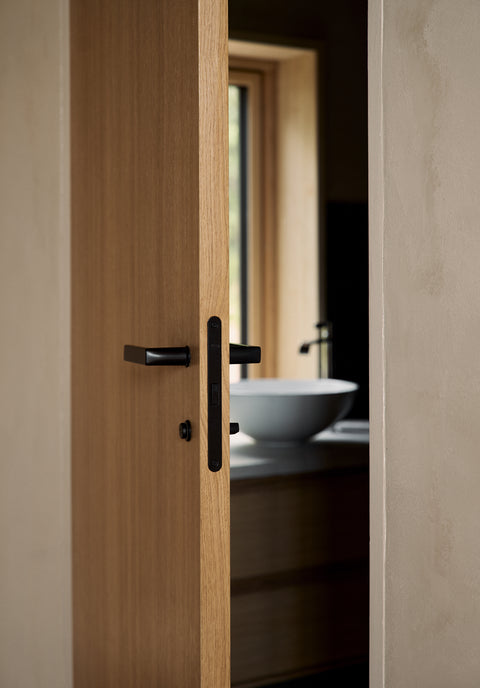 Resultatet är en ren och ostörd yta, där dörrens design, kulör och material får stå i fokus. Avsaknaden av metallbeslag bidrar till en slät, harmonisk och visuellt sammanhängande estetik.