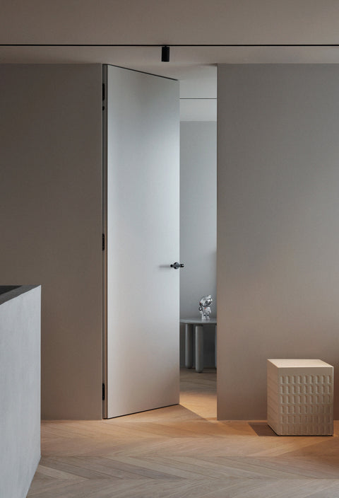 Karm k03 är vår helt dolda karm som spacklas in för en sömlös integration med väggen. I kombination med dolda gångjärn skapar denna lösning en minimalistisk känsla där dörrbladet framstår som en del av väggytan.