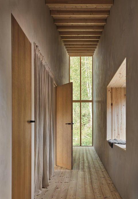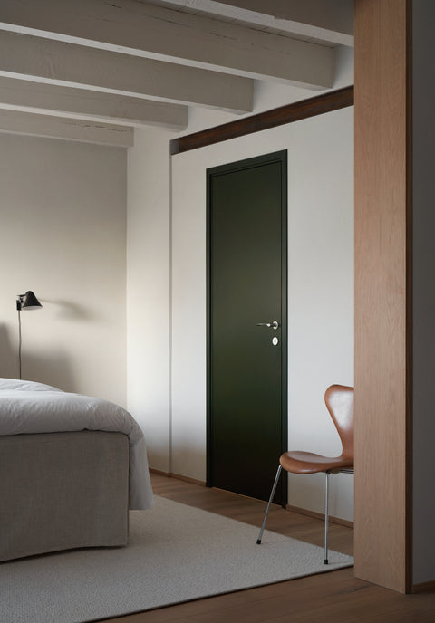 Alla våra dörrblad tillverkas med massiv träkärna. Hos oss innebär det att hela dörren, inte bara ramen, består av kompakt material. Hos många andra tillverkare kan en ”massiv” dörr i själva verket ha en massiv ram men en ihålig kärna. Skillnaden märks tydligt – både i hur dörren dämpar ljud och i känslan när du stänger den.