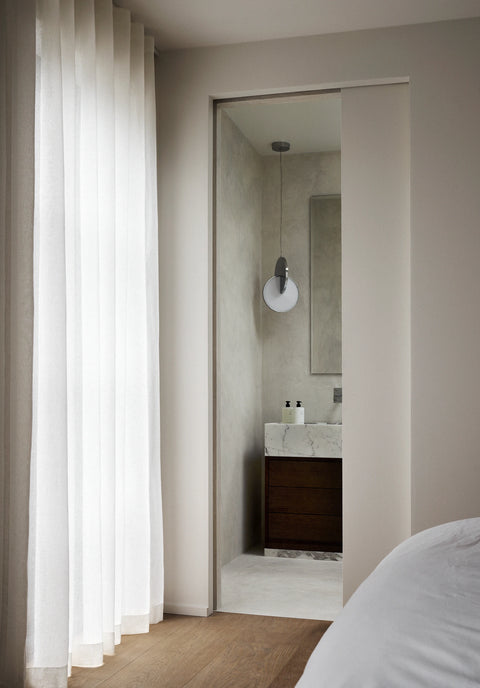 När du väljer en skjutdörr med skena har du full frihet att utforma hur öppningen ska se ut. För en minimalistisk stil kan du gipsa i öppningen. Om du istället föredrar lister, kan du själv välja material och dimensioner för att skapa exakt det uttryck du önskar.