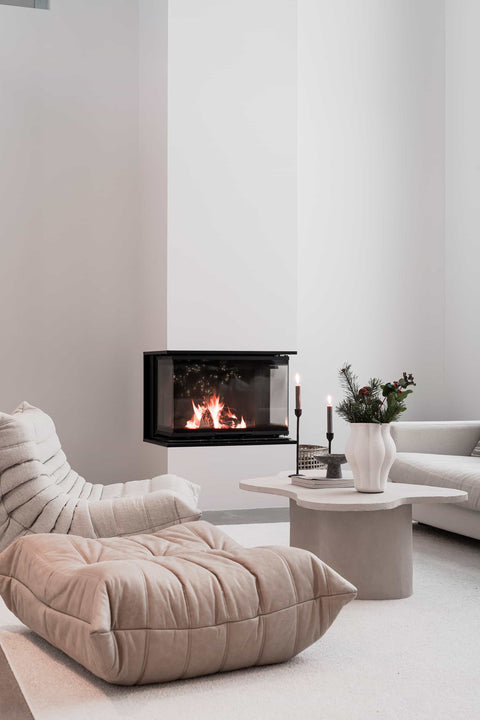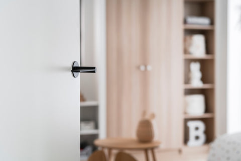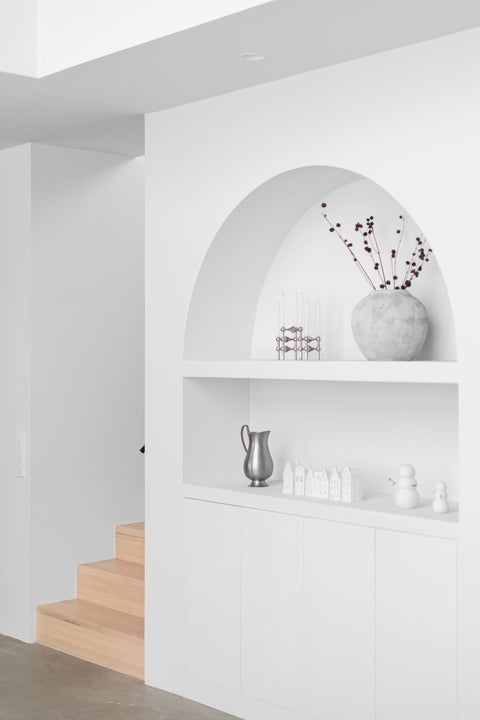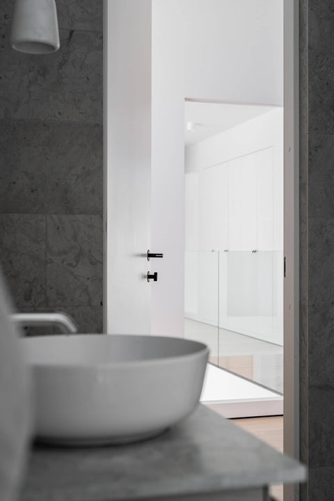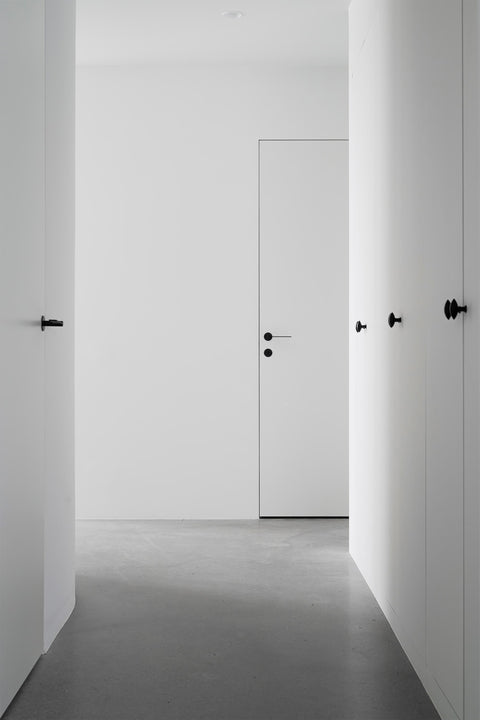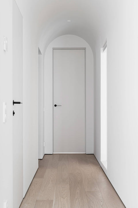 Inuti huset har man strävat efter att skapa en minimalistisk men ändå mysig atmosfär. Emmy har valt jordnära färger och genomgående material genom hela huset för att skapa en enhetlig stil. Det är samma sten i köket och badrummen, ek i köket och på övervåningen, samt kalksten på golven i entrén och i båda badrummen. En annan viktig detalj är dörrarna med dolda karmar från Njord, som Emmy föll för efter att ha sett dem på Instagram. Och dörrarna i huset är något som Emmy verkligen har fokuserat på. "Jag ville ha dörrar som smälter in i resten av inredningen," förklarar Emmy, "och när jag såg Njords dörrar visste jag att de skulle vara perfekta för vårt hem. De är minimalistiska och diskreta, men samtidigt otroligt eleganta." Emmy valde dörrar som är högre än standard i en vacker, varm grå ton - samma NCS-kulör som väggarna - som harmoniserar perfekt med de jordnära färgerna i resten av huset. När hon nu ser på dörrarna kan hon inte hålla tillbaka ett leende. "De är tunga, känns gedigna, bra ljudisolerade och precis så vackra som jag hoppades att de skulle vara. Jag är så glad att vi valde dem."