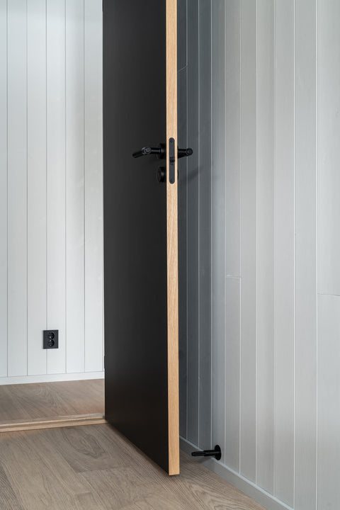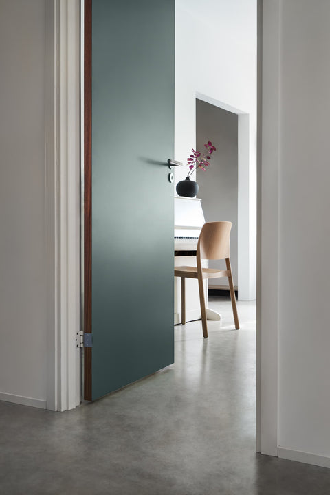En innerdörr som består av massiv trä rakt igenom hela kärnan och ett ytskikt i MDF som målas i valfri NCS-kulör. Den massiva kärnan bidrar till att dörren får bättre ljuddämpande förmåga, lång livslängd och en högre kvalitetskänsla. Dörren kantlistas i en avvikande fanérkantlist.