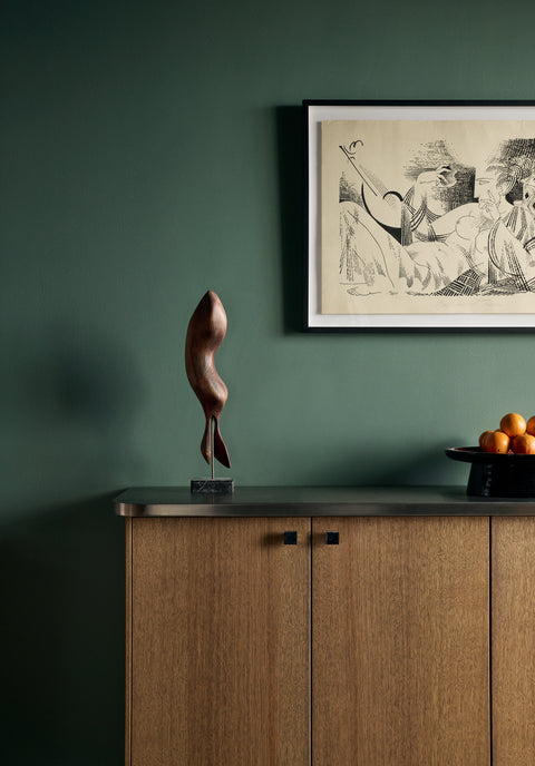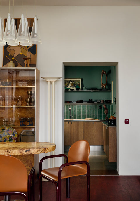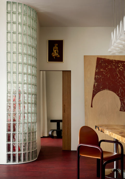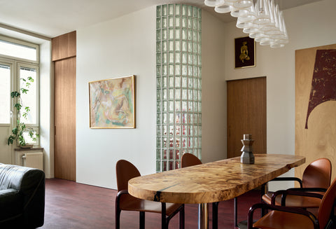 The dining area is the natural heart of the home. A centrally placed long table, designed by Hans and Amanda themselves, stands there. The table, whose solid mappa burl top was crafted by the fine cabinetmakers at Ateljé Örnsberg, is only 65 centimetres deep. The inspiration came from friends in Berlin, where the narrow design fosters an intimate closeness among dinner guests. Around the table are chairs designed by the Italian Gae Aulenti, acquired through antique contacts.