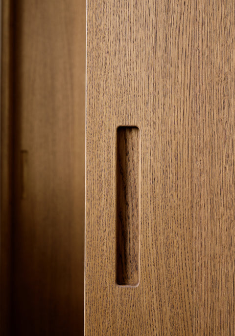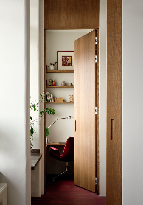 "With an impressive height of 2.7 metres and over-panels in a matching veneer, they serve as much more than mere room dividers," explains Hans. "When closed, they appear almost as majestic portals or standalone works of art. This solution creates a stronger architectural effect than if the doors had extended all the way to the ceiling. And the milled grip handles contribute to a soft and pleasant experience every time the doors are used," he adds.
