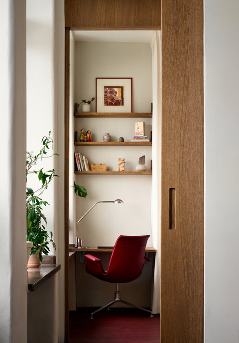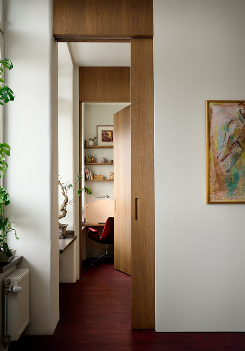 The choice of materials is imbued with a sustainable mindset and a desire to preserve. Beneath a layer of oak parquet in the hall and kitchen, they discovered the original floor of Öland limestone. This was polished back to its former glory, while the reclaimed parquet was used to repair the floors in the other rooms of the home. To give the classic oak parquet a new and exciting lease of life, it was stained a deep oxblood red, a tone meticulously developed with its own NCS code. This vibrantly coloured floor became the unifying thread of the home. To soften the transition between the wooden and stone floors, elegant thresholds in red Jämtland limestone were custom-made.