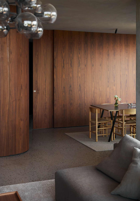 "We wanted to create a structure that is both raw and sophisticated. Concrete was replaced with cement render during the project, but the intent remained the same – a robust structure meeting soft details like walnut and sheer linen curtains," explains Ariel.