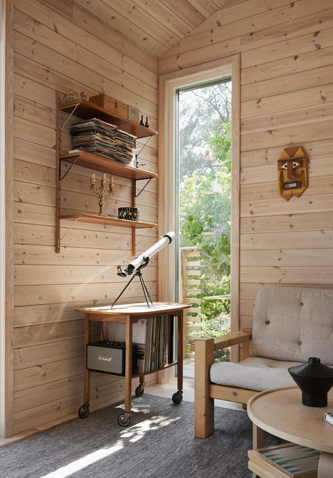 With compact living, every centimeter and every detail is important. Both houses have been clad internally with horizontal wooden panels and adapted with massive doors from the Swedish manufacturer Njord.