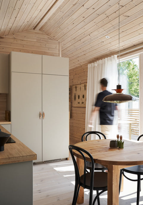 "Sofia and I have had the same opinions about the interior design. We wanted a classic holiday home feel but still modern and we reasoned many times with Enkelrum's architect. We wanted to stick to wood and have also chosen wood in the furniture and other furnishings. Several pieces of furniture come from the previous cabin and to avoid the feeling of a newly built mountain cabin, we prefer to shop at flea markets rather than buy newly produced. We have said no plastic in the houses, but it is not quite that simple".