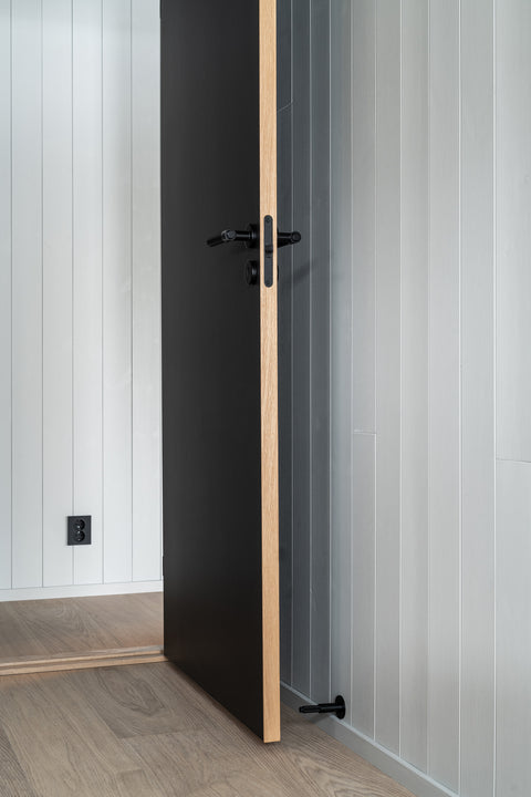 To complement the charred doors, there are also the elegant black frame doors, where the wooden edge of the oak veneer creates a warm and soft contrast. This balances the overall impression and creates an inviting and harmonious atmosphere. A perfect place to relax after a day in nature.